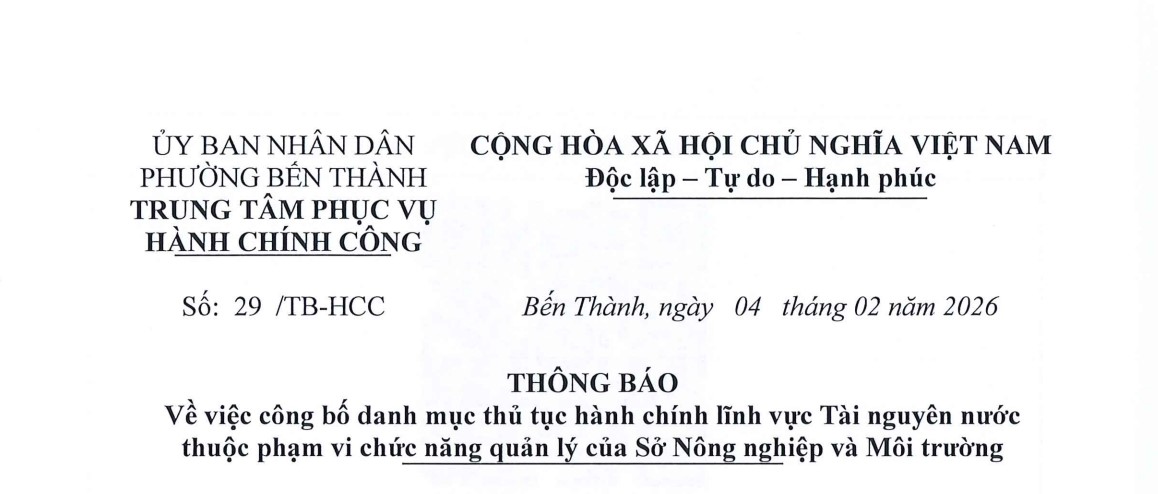 Thông báo về việc công bồ danh mục thủ tục hành chính lĩnh vực Tài nguyên nước thuộc phạm vi chức năng quản lý của Sở Nông nghiệp và Môi trường 5 Tháng 2, 2026