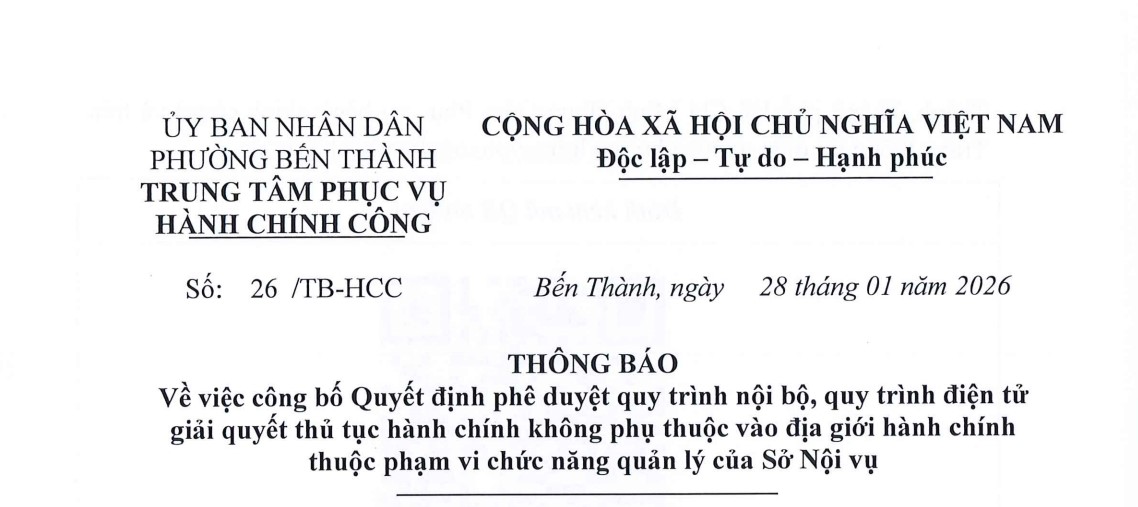 Thông báo về việc công bố Quyết định phê duyệt quy trình nội bộ, quy trình điện tử giải quyết thủ tục hành chính không phụ thuộc vào địa giới hành chính thuộc phạm vi chức năng quản lý của Sở Nội vụ