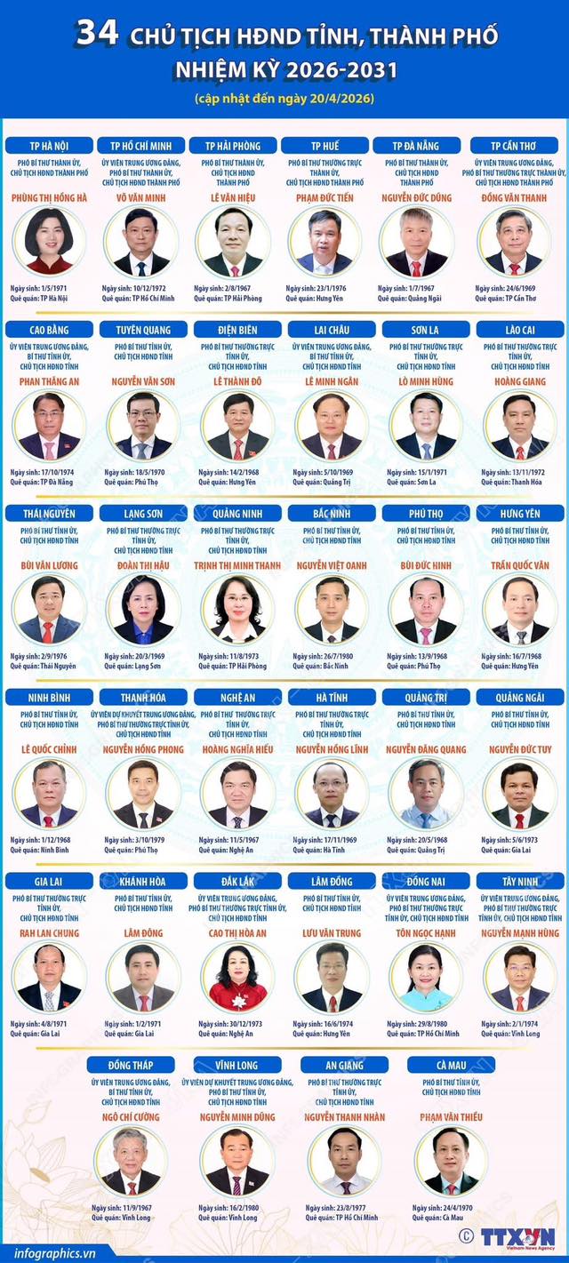 <div class="xdj266r x14z9mp xat24cr x1lziwak x1vvkbs x126k92a"> <div dir="auto">Trân trọng giới thiệu thông tin về 34 Chủ tịch HĐND tỉnh, thành phố nhiệm kỳ 2026-2031.</div> <div dir="auto"><img class="alignnone size-full wp-image-58648" src="https://phuongbenthanh.gov.vn/wp-content/uploads/2026/04/675353334_1348320263995568_4611843296182649108_n.jpg" alt="" width="640" height="1421" /></div> </div> <div class="x14z9mp xat24cr x1lziwak x1vvkbs xtlvy1s x126k92a"> <div dir="auto">TTXVN</div> </div>