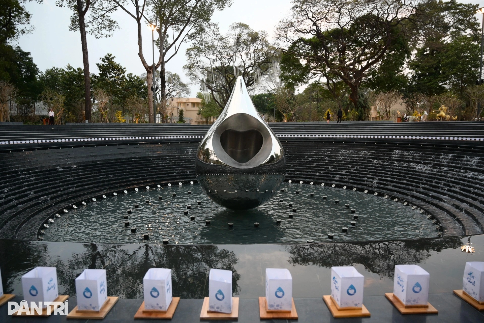 Bao quanh tượng đài là 9 bậc cấp và 360 ngọn nến nước. Ban đêm, cùng gần 1.000 điểm sáng, không gian trở nên lung linh, tĩnh lặng như “rừng ánh nến” tưởng niệm các nạn nhân Covid-19.