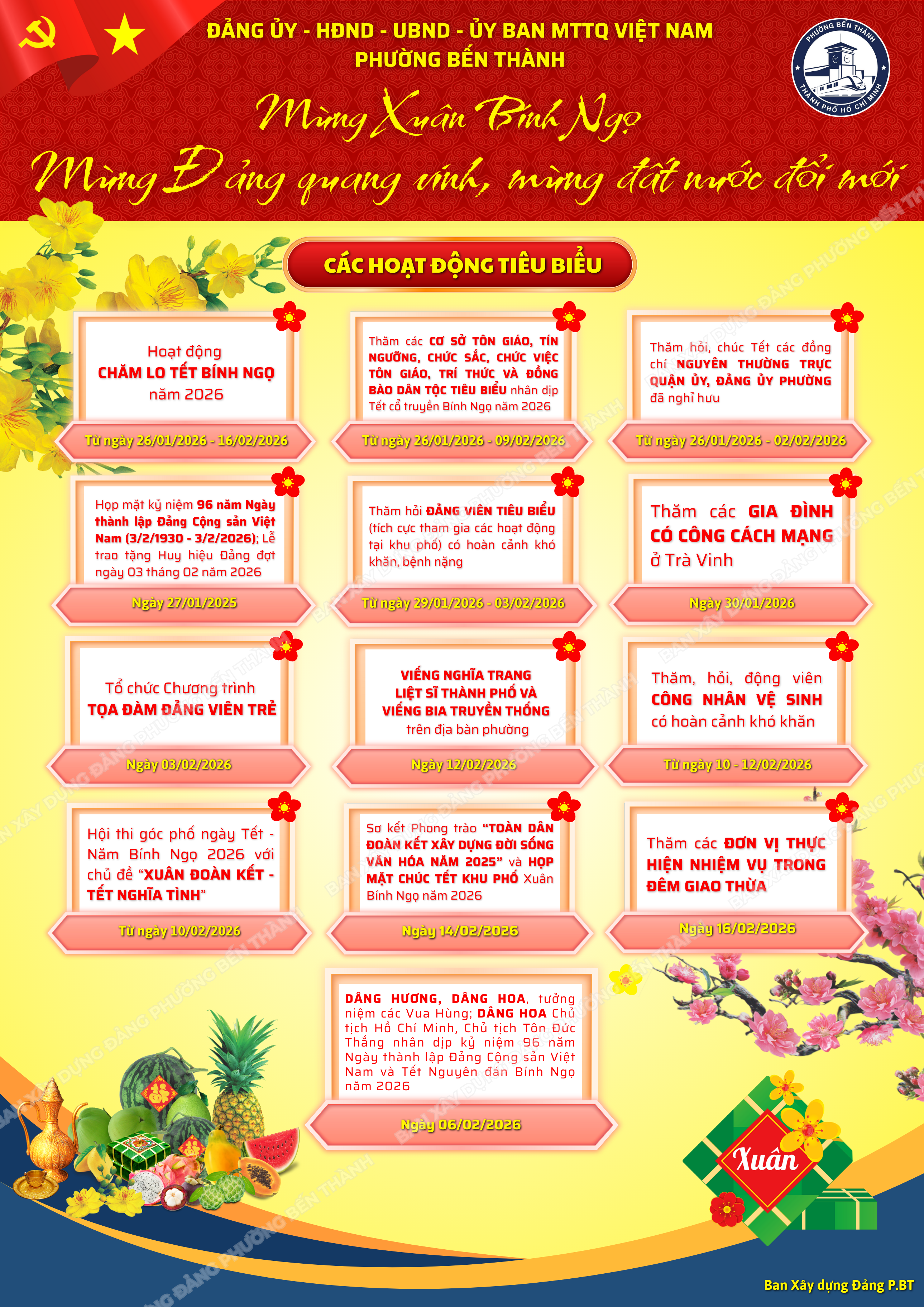 TRÂN TRỌNG KÍNH MỜI CÁC ĐỒNG CHÍ CÁN BỘ, ĐẢNG VIÊN VÀ NHÂN DÂN TRÊN ĐỊA BÀN PHƯỜNG BẾN THÀNH CÙNG THAM GIA CÁC HOẠT ĐỘNG MỪNG XUÂN BÍNH NGỌ – MỪNG ĐẢNG QUANG VINH – MỪNG ĐẤT NƯỚC ĐỔI MỚI CỦA ĐẢNG ỦY – HĐND – UBND – ỦY BAN MTTQ VIỆT NAM PHƯỜNG BẾN THÀNH