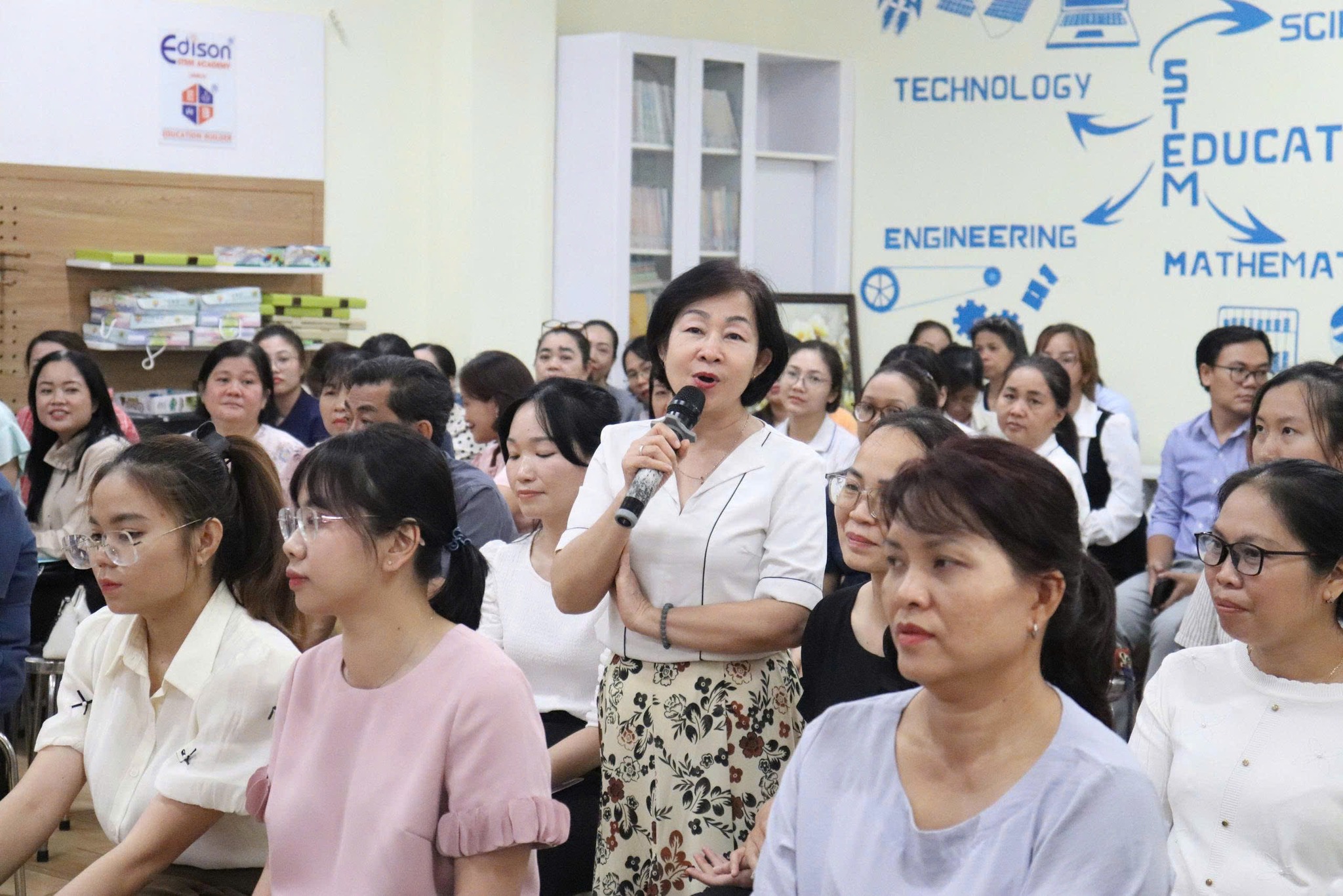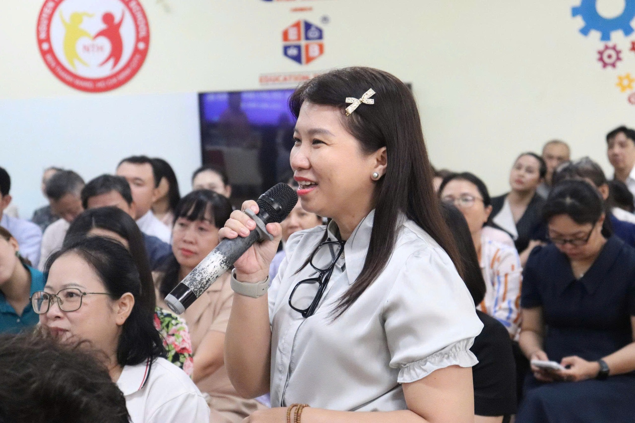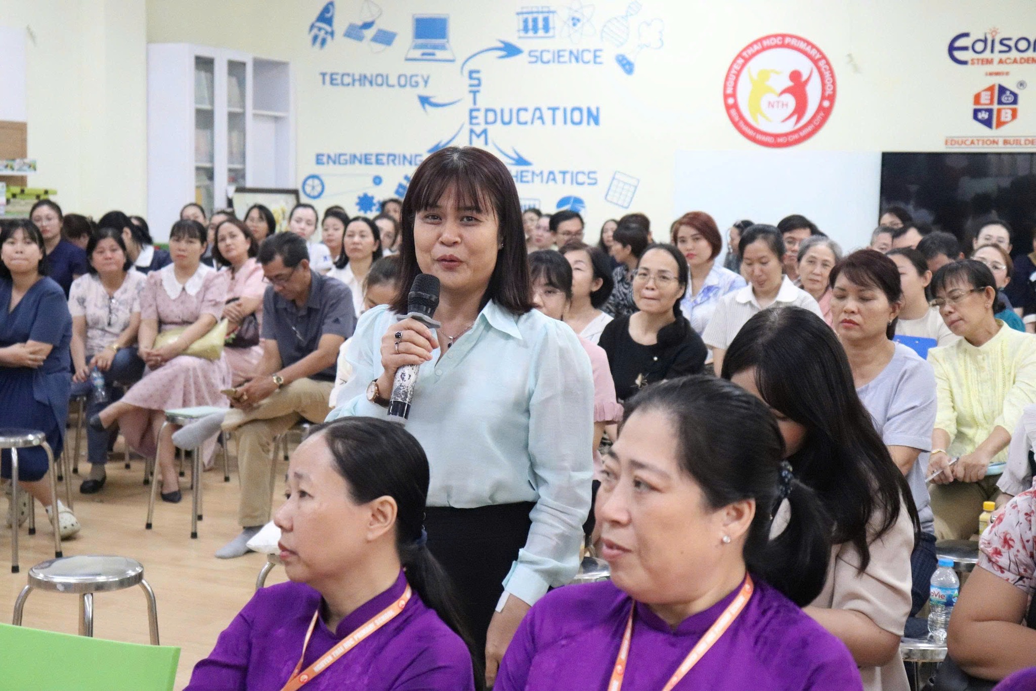 Phần thảo luận diễn ra sôi nổi với nhiều ý kiến trao đổi thực tiễn xoay quanh việc vận dụng AI, điều kiện triển khai công nghệ thông tin cũng như xây dựng nội dung bài dạy phù hợp với học sinh tiểu học. Các ý kiến được chia sẻ thẳng thắn, cởi mở và nhận được sự phản hồi, trao đổi tích cực từ đội ngũ cán bộ quản lý và giáo viên tham dự.